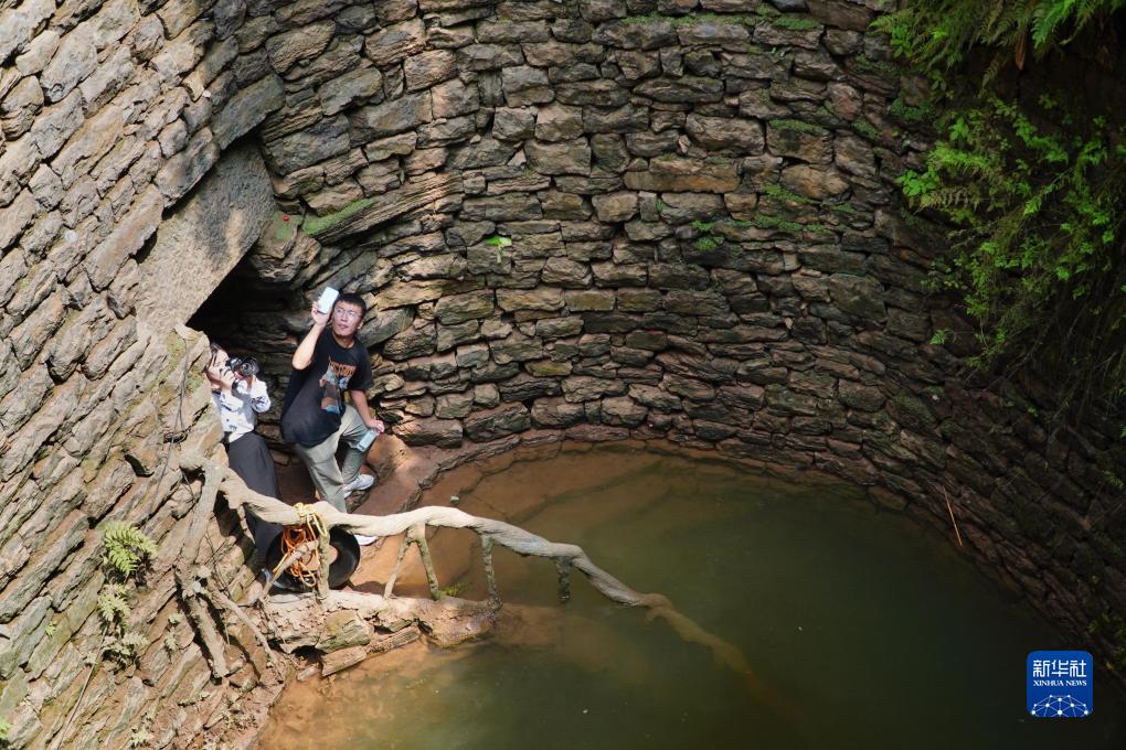 游客在位于山東省新泰市龍廷鎮的掌平洼井游覽(7月26日攝)。