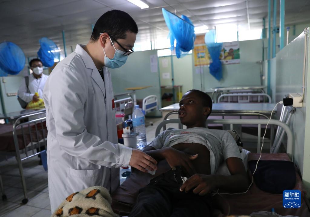7月27日,在莫桑比克首都馬普托的馬普托中心醫院,中國醫療隊泌尿外科醫生劉攀在病房查看一名術(shù)后病人。