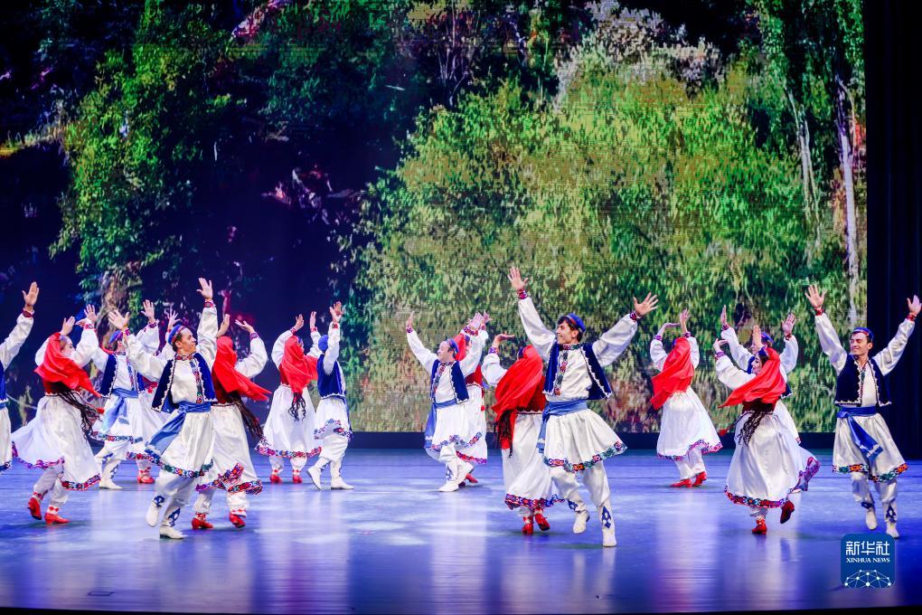 7月27日,塔吉克斯坦羅拉國家功勛歌舞團演員在演出。