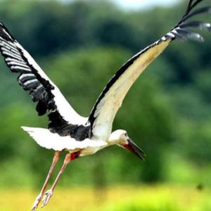 在江西省進(jìn)賢縣鐘陵鄉,被救治康復后的東方白鸛向田野飛去(7月20日攝)。