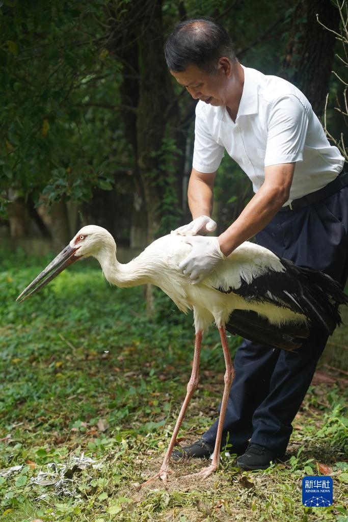 在位于江西省永修縣的江西鄱陽(yáng)湖國家級自然保護區吳城保護站,王小龍在安撫一只東方白鸛(7月15日攝)。