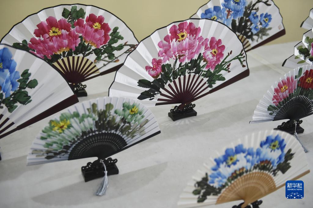 這是7月26日在平樂(lè )社區的牡丹畫(huà)創(chuàng )意產(chǎn)業(yè)園區展廳內拍攝的牡丹畫(huà)扇面作品。