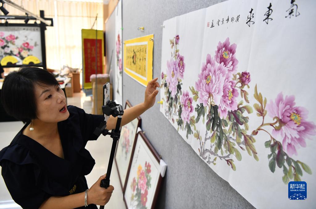 7月26日,工作人員在平樂(lè )社區的牡丹畫(huà)創(chuàng )意產(chǎn)業(yè)園區內直播銷(xiāo)售牡丹畫(huà)。