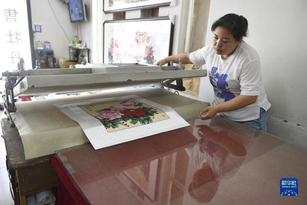 7月26日,工作人員在平樂(lè )社區的牡丹畫(huà)創(chuàng )意產(chǎn)業(yè)園區工作室內裝裱牡丹畫(huà)。