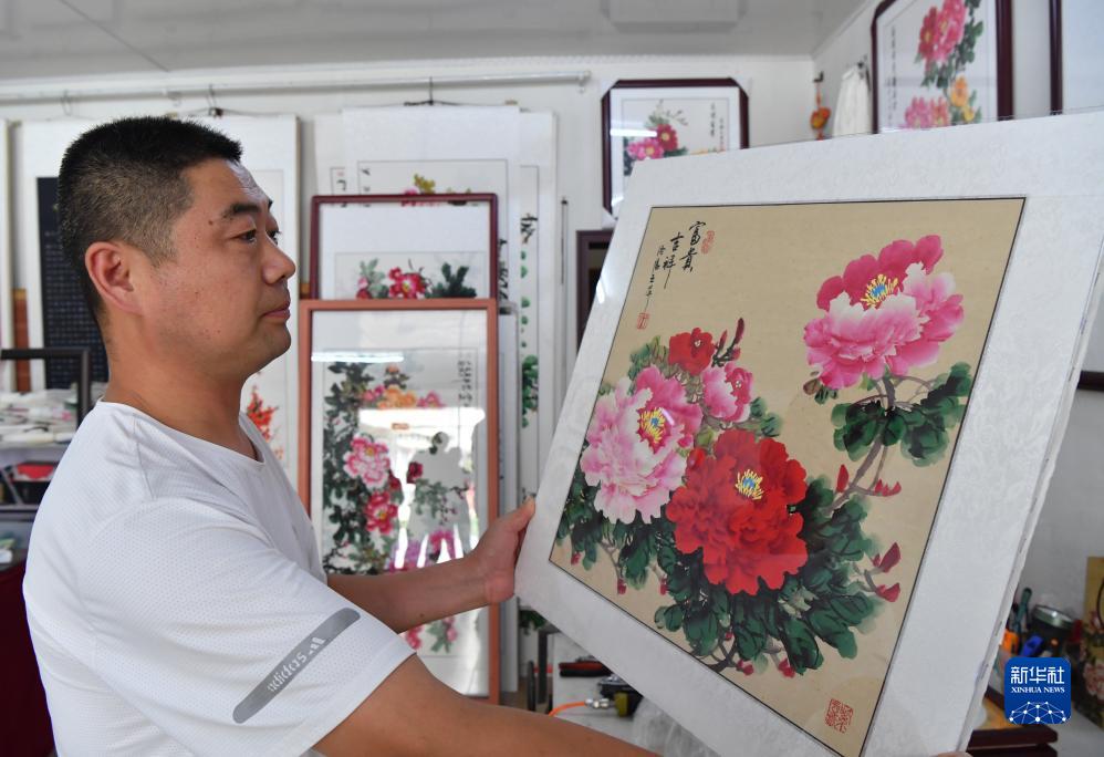 7月26日,工作人員在平樂(lè )社區的牡丹畫(huà)創(chuàng )意產(chǎn)業(yè)園區內查看裝裱后的牡丹畫(huà)。