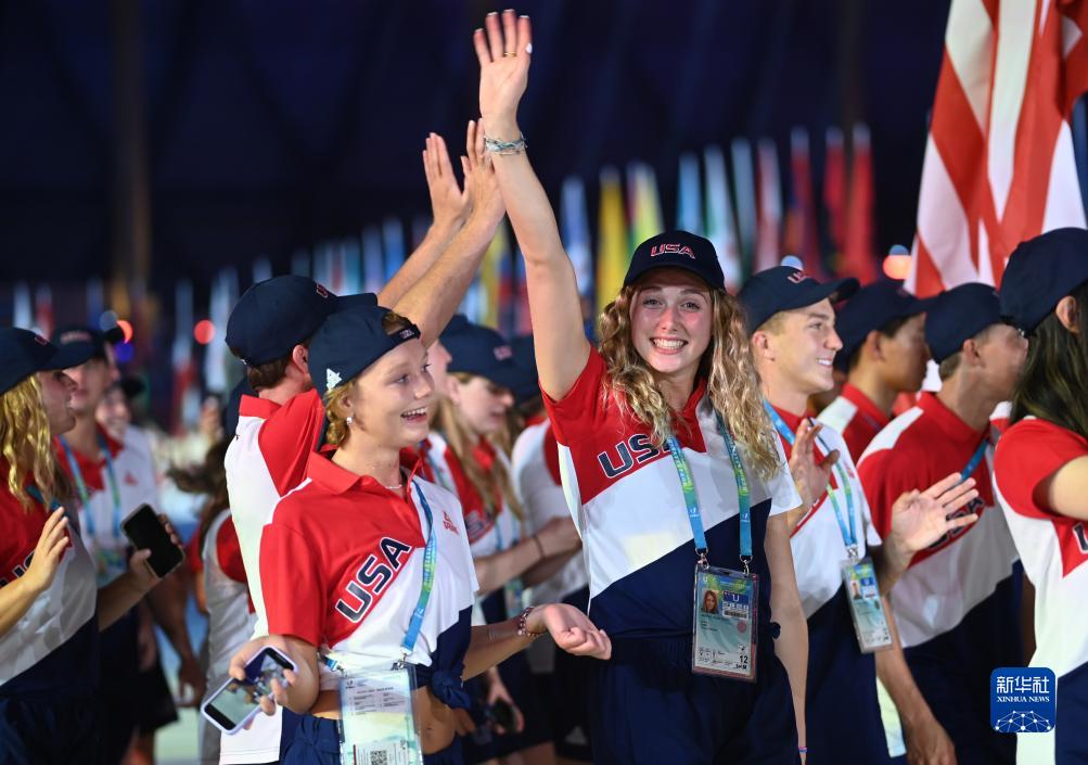 7月28日,美國大學(xué)生體育代表團在開(kāi)幕式上入場(chǎng)。