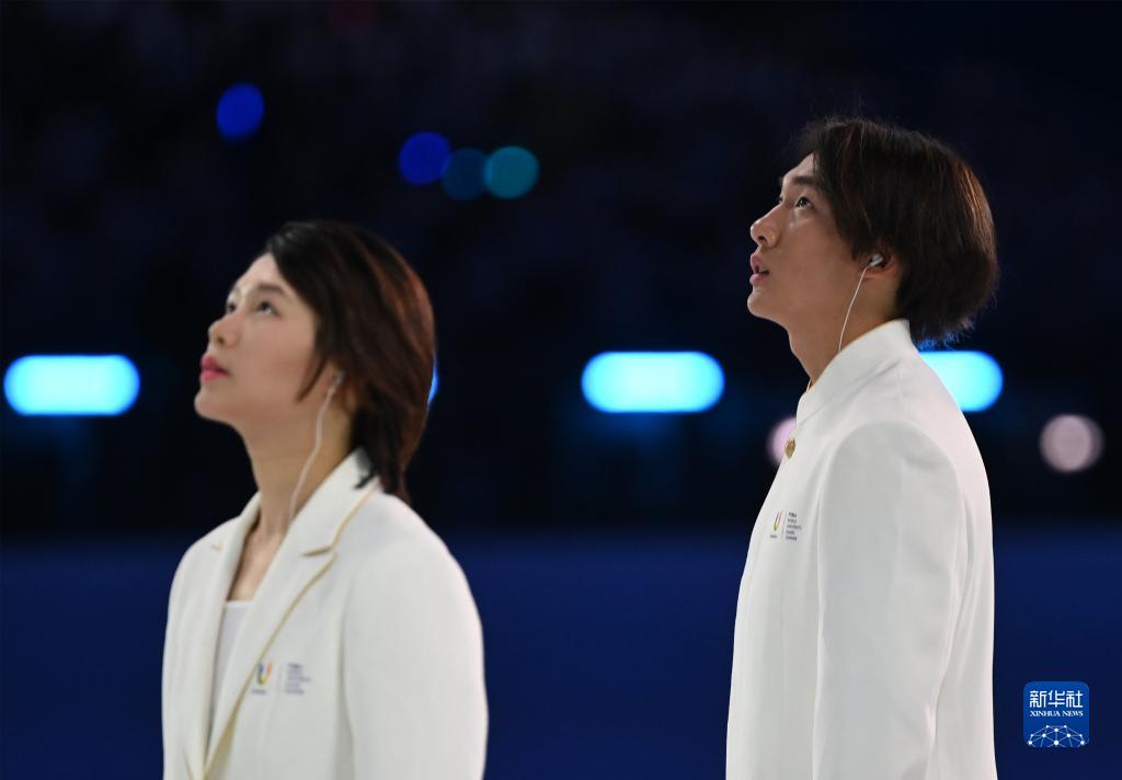 7月28日,國際大學(xué)生體育聯(lián)合會(huì )會(huì )旗執旗手蘇翊鳴(右)和施廷懋在開(kāi)幕式上。