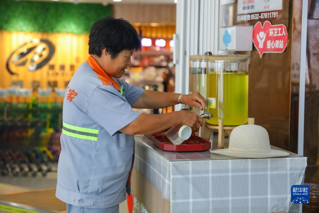 7月27日,在山東省青島市李滄區一家商場(chǎng)內,環(huán)衛工人接取免費的茶飲消暑止渴。