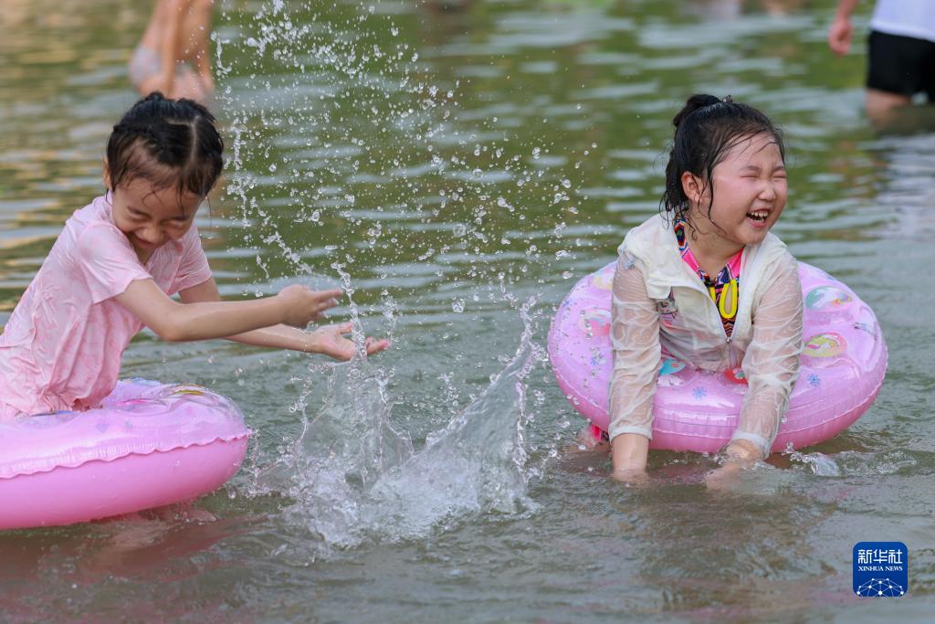 7月26日,小朋友在山東省棗莊市山亭區一處兒童親水區戲水玩耍。