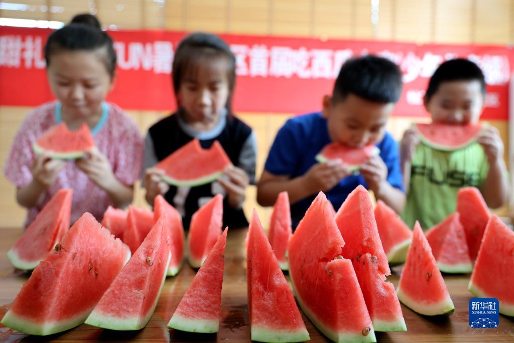 7月23日,在山東省濱州市濱城區杜店街道秦淮社區,小朋友們參加吃西瓜比賽。
