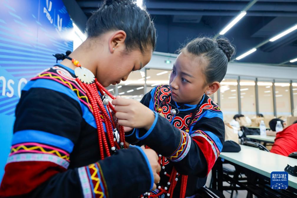 7月23日,在成都大運會(huì )開(kāi)幕式彩排之前,吉合拉作(右)幫助同伴俄地惹漢整理飾品。新華社記者 沈伯韓 攝