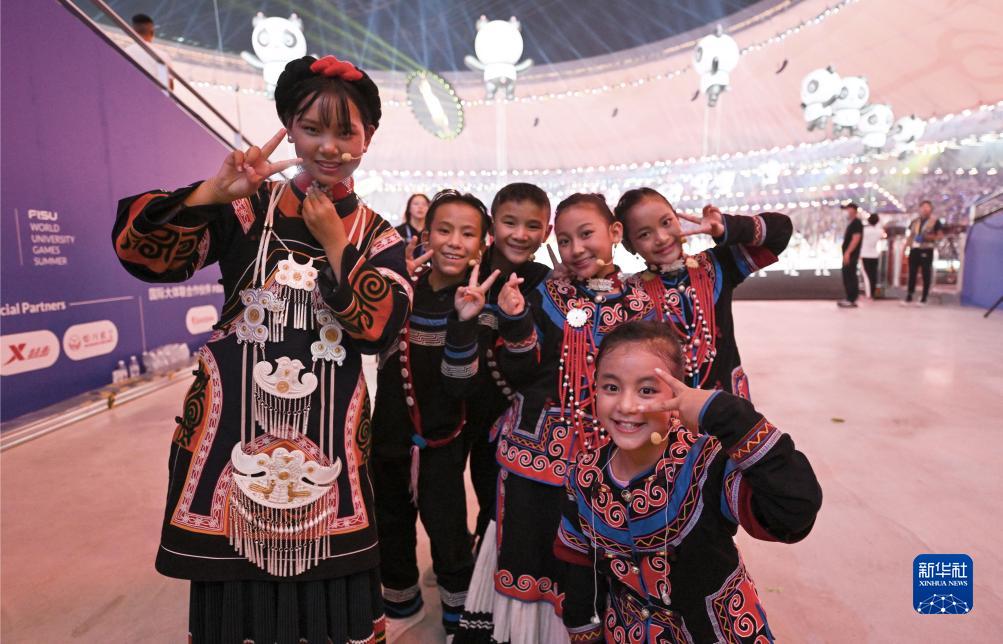 7月28日,來(lái)自四川涼山彝族自治州的孩子們在成都大運會(huì )開(kāi)幕式結束后合影留念。新華社記者 胥冰潔 攝
