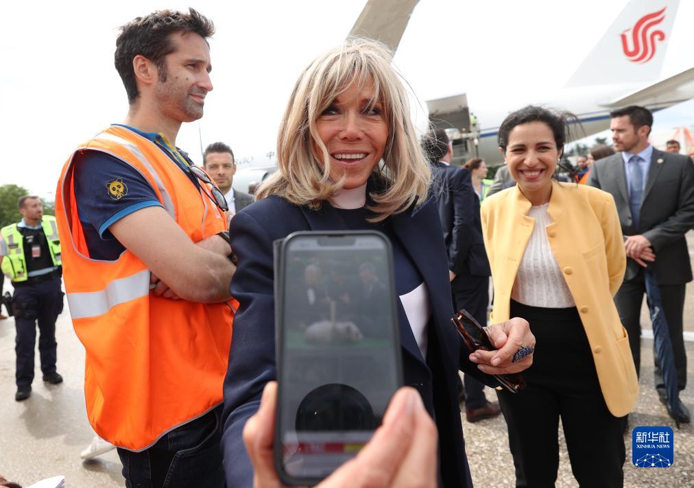 7月25日,在法國巴黎戴高樂(lè )機場(chǎng),法國總統夫人布麗吉特·馬克龍用手機展示她與大熊貓“圓夢(mèng)”的合影。