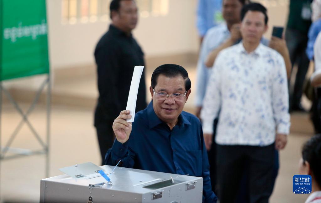 7月23日,柬埔寨首相洪森(中)在柬埔寨甘丹省一處投票站投票。