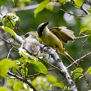 一只伯勞(右)和幼鳥(niǎo)在拉薩市城關(guān)區一處庭院的樹(shù)枝上(7月28日攝)。