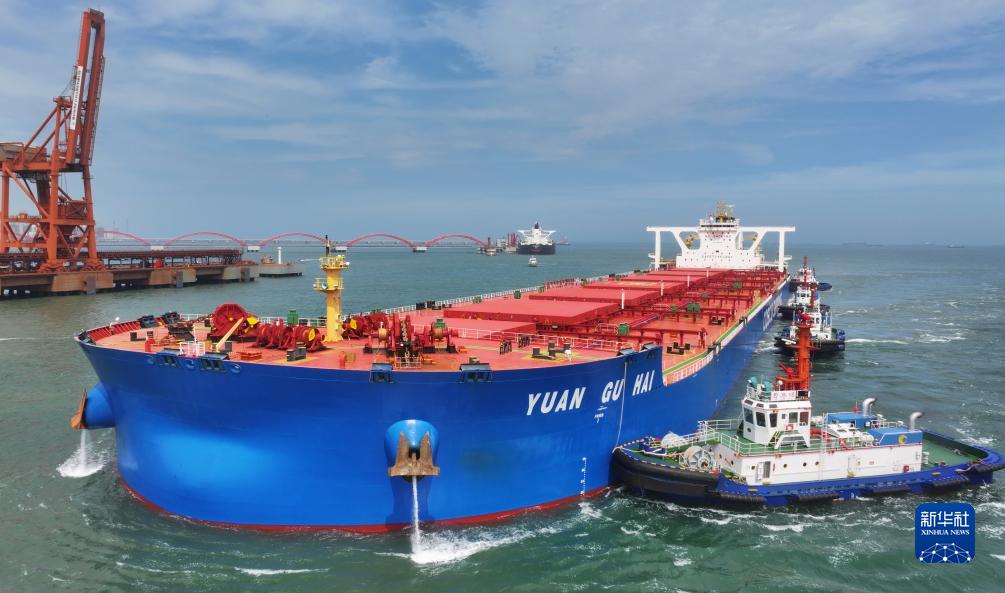 7月28日,滿(mǎn)載約40萬(wàn)噸巴西鐵礦石的“遠谷?!陛喸谕陷喌膮f(xié)助下向河北港口集團唐山港曹妃甸港區礦石碼頭靠泊(無(wú)人機照片)。