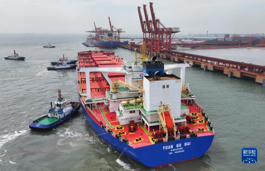 7月28日,滿(mǎn)載約40萬(wàn)噸巴西鐵礦石的“遠谷?!陛喸谕陷喌膮f(xié)助下向河北港口集團唐山港曹妃甸港區礦石碼頭靠泊(無(wú)人機照片)。
