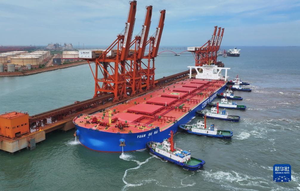 7月28日,滿(mǎn)載約40萬(wàn)噸巴西鐵礦石的“遠谷?!陛喸谕陷喌膮f(xié)助下向河北港口集團唐山港曹妃甸港區礦石碼頭靠泊(無(wú)人機照片)。