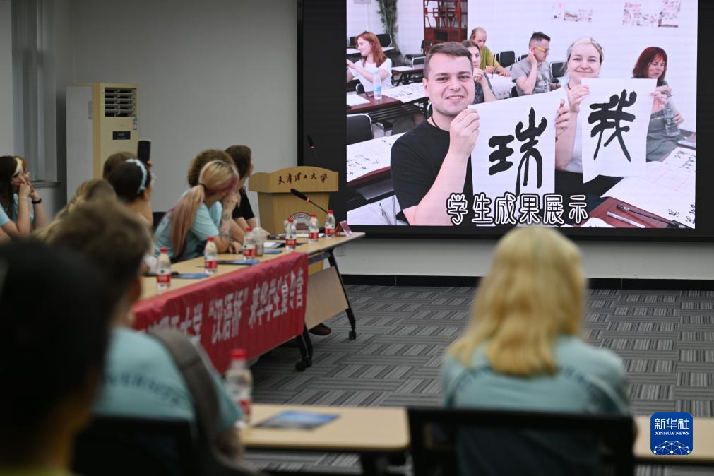 7月29日,參加夏令營(yíng)的來(lái)華學(xué)生在結業(yè)式上觀(guān)看視頻。