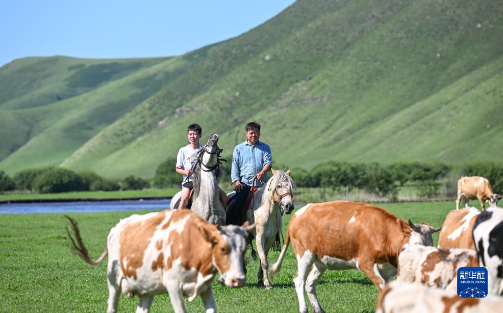 7月25日,吳蘇道(右)和兒子吳蘇日力格在草場(chǎng)上騎馬趕牛。