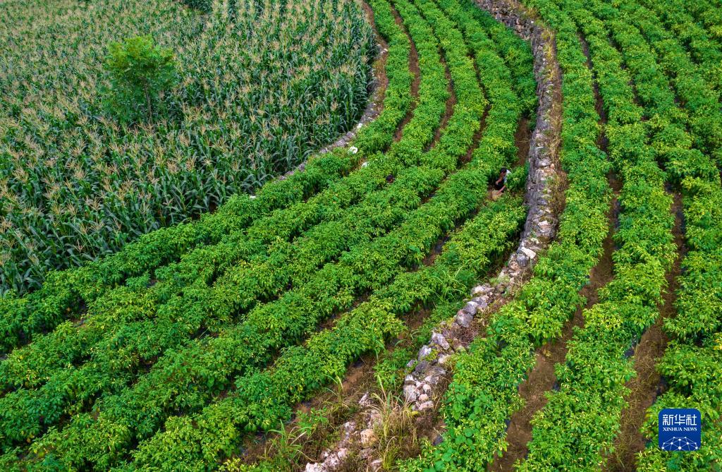 一位村民在木者村“摸石谷”中建造的“三?!迸_地上干農活(無(wú)人機照片,7月27日攝)。新華社記者 楊植森 攝