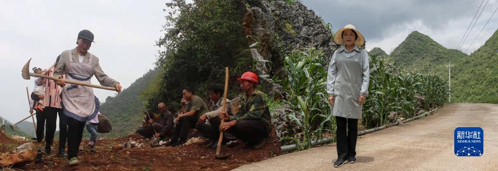 這是一張拼版照片:左圖為2009年謝成芬(前左)帶領(lǐng)村民一起修路時(shí)的資料照片(西疇縣融媒體中心供圖);右圖為2023年7月27日,謝成芬站在修好的出村公路上(新華社記者費茂華攝)。新華社發(fā)