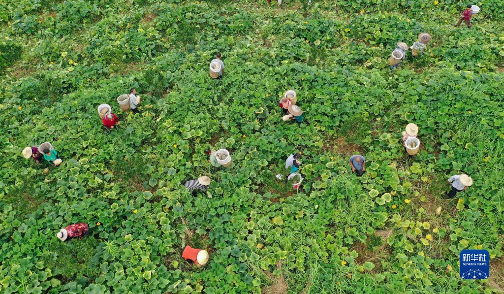 7月29日,農民在貴州省銅仁市松桃苗族自治縣大路鎮和平村采收南瓜(無(wú)人機照片)。