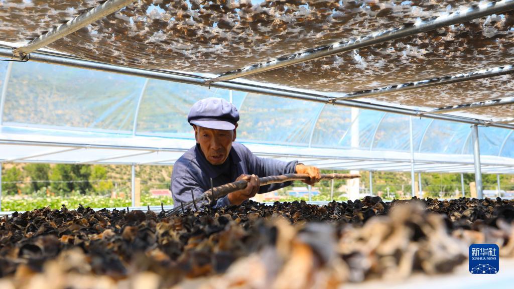 7月29日,在卓尼縣納浪鎮納浪村黑木耳種植基地,農戶(hù)在翻曬黑木耳。