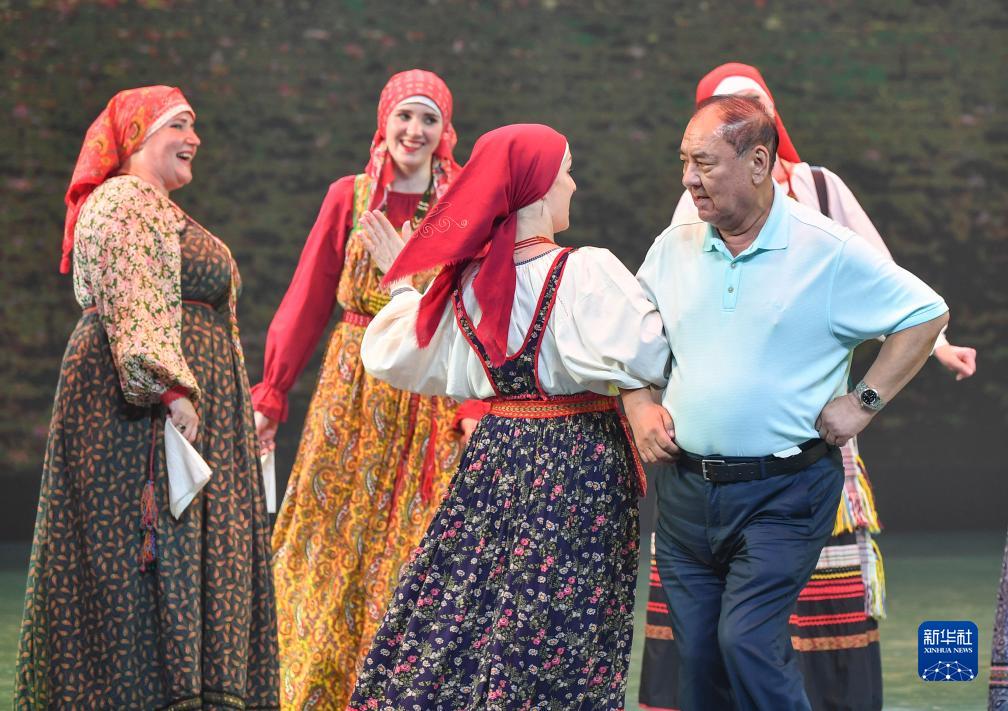 在烏魯木齊晚報劇院,俄羅斯薩拉托夫州曙光歌舞團的演員邀請現場(chǎng)觀(guān)眾同臺共舞(7月22日攝)。