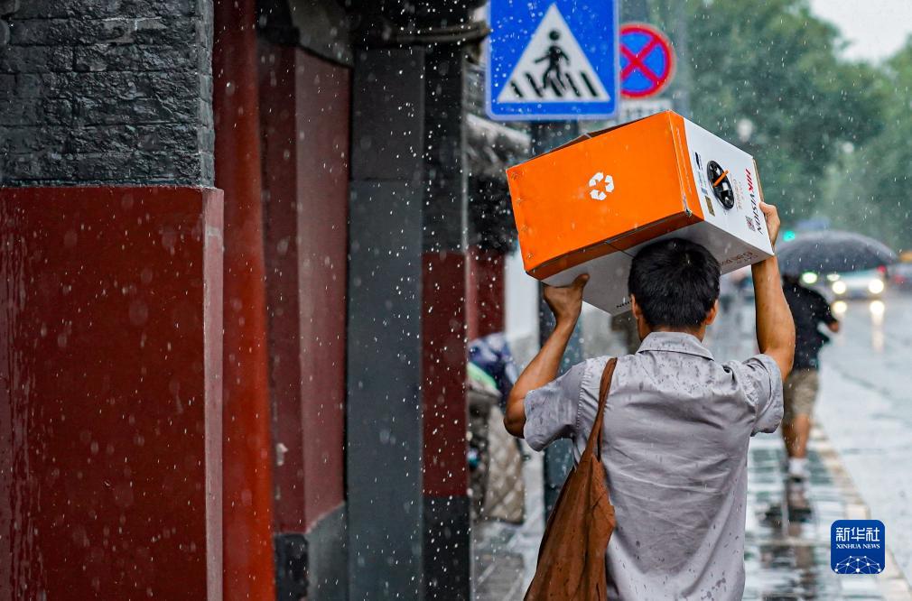 7月30日,在北京雍和宮大街,市民用紙箱擋雨前行。
