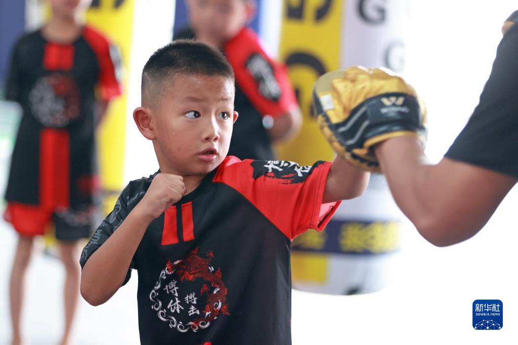 7月30日,孩子們在貴州省黔東南苗族侗族自治州岑鞏縣一家搏擊館練習搏擊。