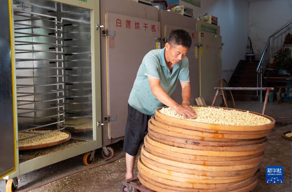 7月31日,在湖南省湘潭縣花石鎮羅漢村一湘蓮加工基地,當地村民準備將湘蓮放入烘干機。