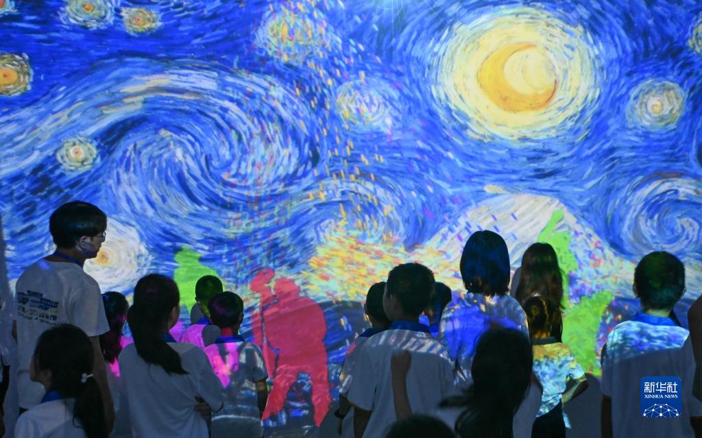 7月30日,在天津數字藝術(shù)博物館,學(xué)生們沉浸式參觀(guān)藝術(shù)作品。