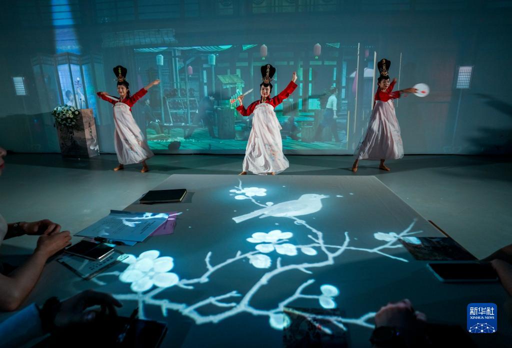 7月31日,演員在《畫(huà)游清明上河――故宮沉浸藝術(shù)展》孫羊店全沉浸光影空間內展示宋朝時(shí)期的文化生活。