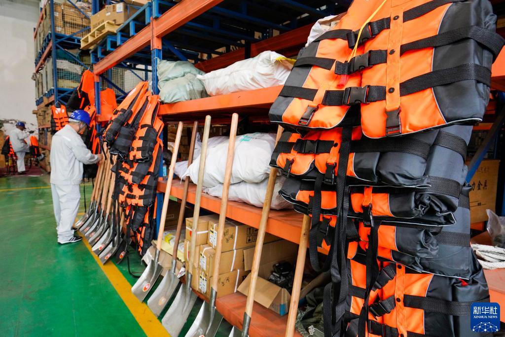 7月31日,工作人員在河北省遵化市一倉庫整理防汛應急搶險工具。