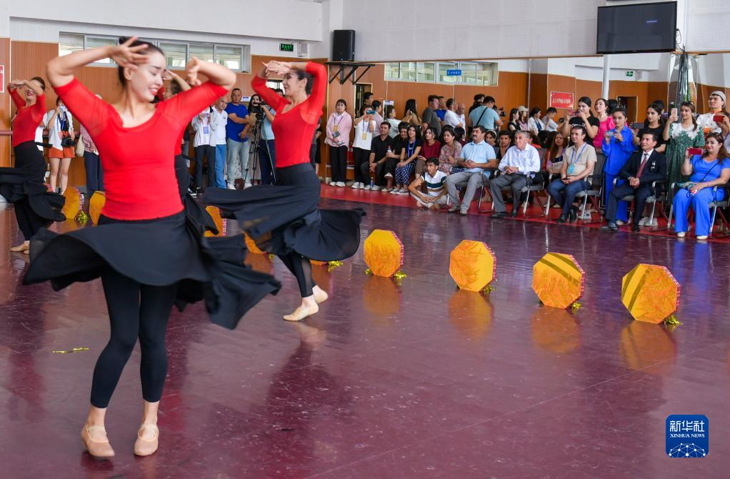 當日,在烏魯木齊參加第六屆中國新疆國際民族舞蹈節的塔吉克斯坦羅拉國家功勛歌舞團走進(jìn)新疆藝術(shù)劇院,雙方演員在音樂(lè )、舞蹈等方面進(jìn)行交流,展示絢麗多姿的風(fēng)采。