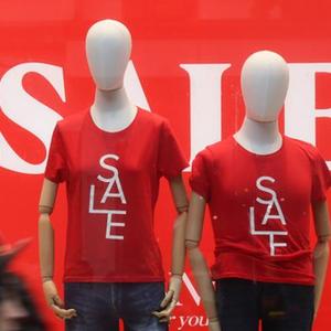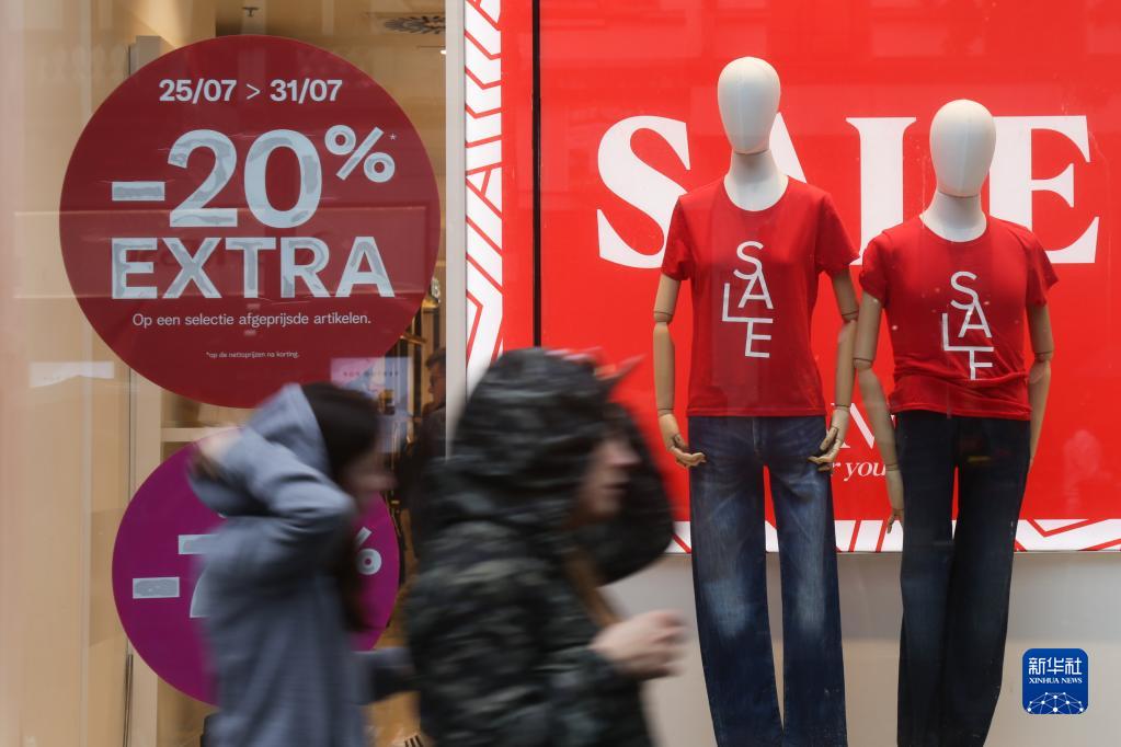 7月31日,在比利時(shí)安特衛普,人們從商業(yè)街上的促銷(xiāo)廣告前走過(guò)。