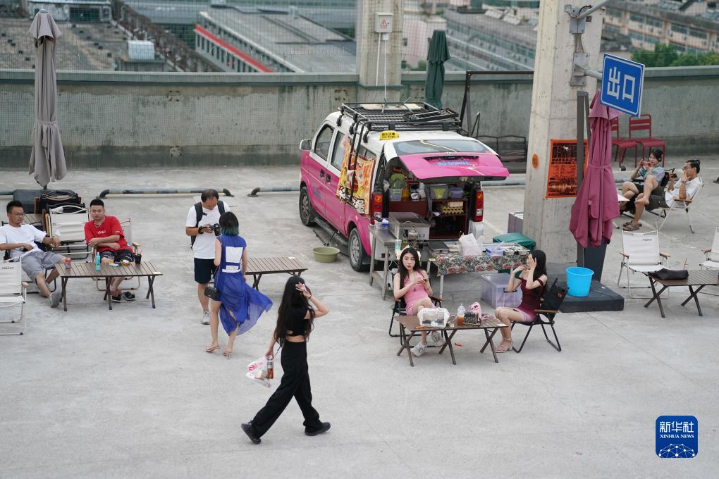 7月26日,年輕人在一棟由停車(chē)樓頂層改造而來(lái)的飲品店內消費休閑。