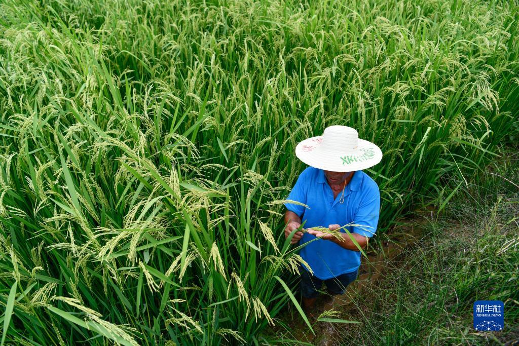 8月1日,農民在貴州省岑鞏縣水尾鎮新場(chǎng)村雜交水稻制種基地查看水稻授粉情況。