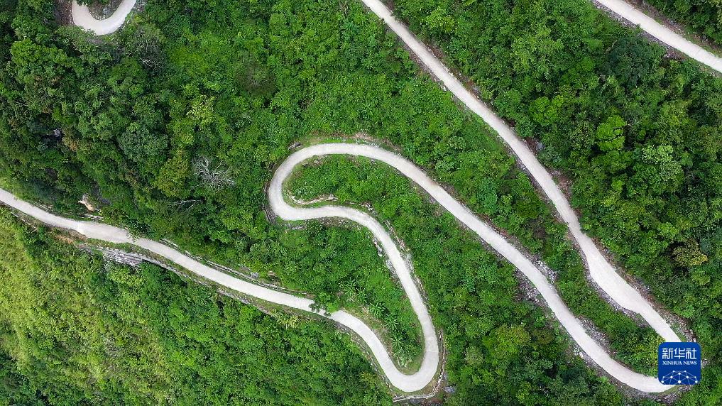 這是廣西那坡縣百省鄉那孟村各酬屯通往百南鄉的“龍拐路”,一里十彎(7月31日攝,無(wú)人機照片)。