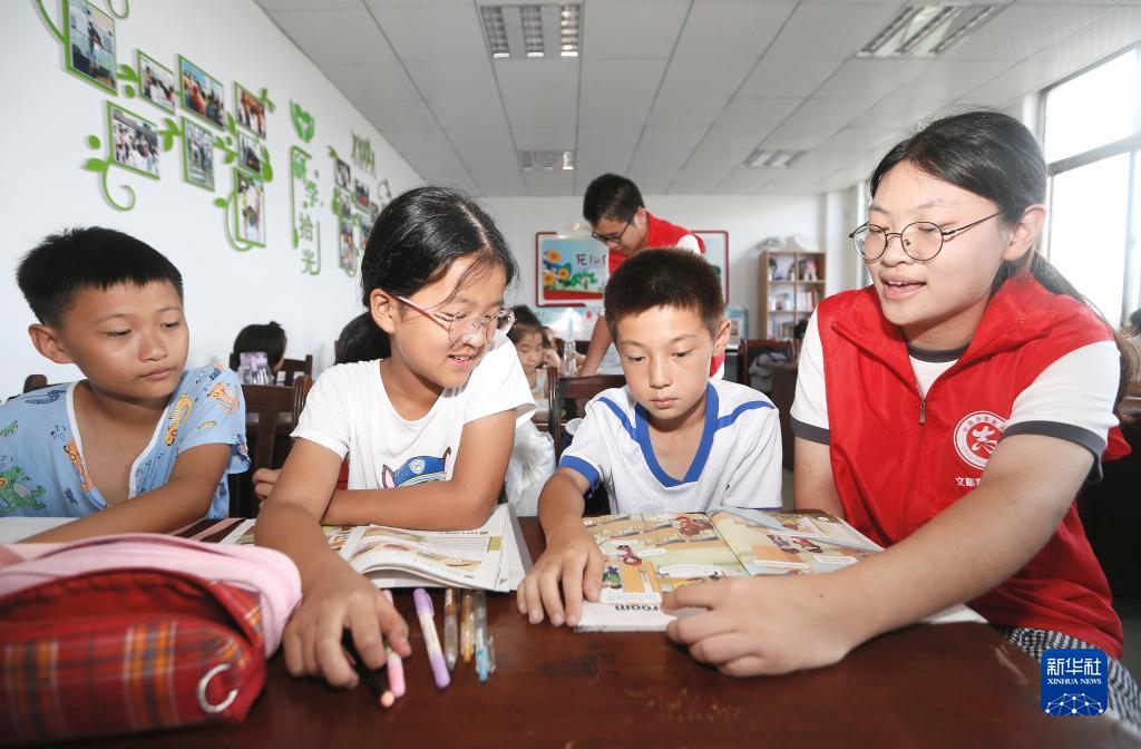 8月1日,在即墨區龍山街道前東葛村新時(shí)代文明實(shí)踐站,臨沂大學(xué)大學(xué)生志愿者宋林駿(右一)輔導學(xué)生的暑假功課。