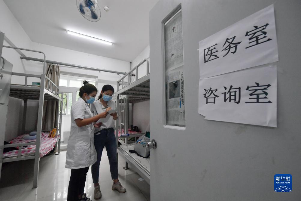 8月1日,在天津市武清區職業(yè)教育中心臨時(shí)安置點(diǎn),醫務(wù)人員在對轉移人員藥品需求進(jìn)行統計。