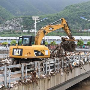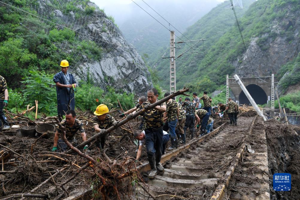 8月1日,在北京市門(mén)頭溝區水峪嘴村附近一段被阻斷的鐵路線(xiàn)上,中鐵六局工作人員在清理軌道上的雜物,全力恢復交通。
