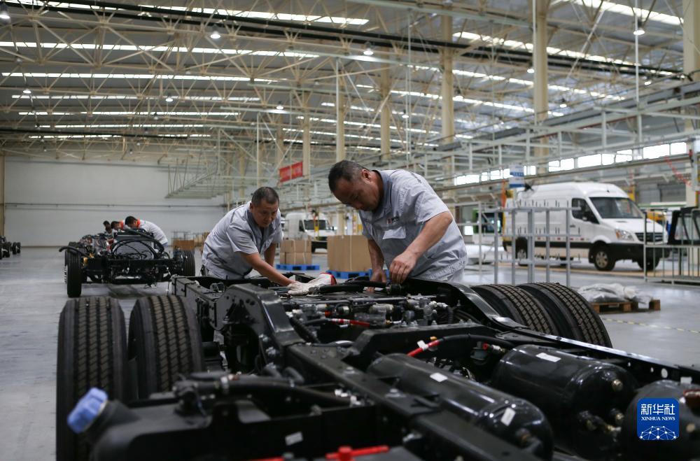 8月1日,工人在襄陽(yáng)騰龍汽車(chē)有限公司生產(chǎn)車(chē)間組裝汽車(chē)底盤(pán)。