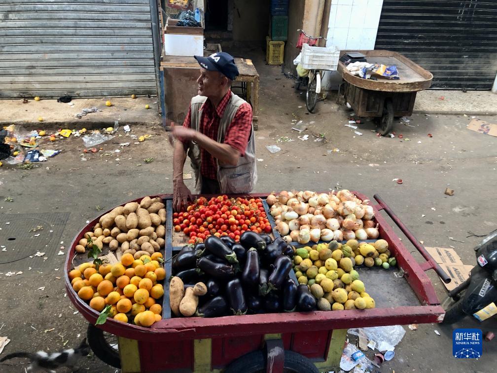 8月1日,在黎巴嫩南部西頓市附近的艾因·哈勒瓦難民營(yíng),一名男子在街上賣(mài)菜。