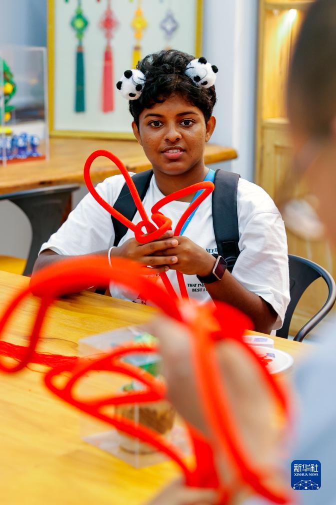 7月31日,在成都大運村,斯里蘭卡運動(dòng)員哈西妮學(xué)習制作中國結。