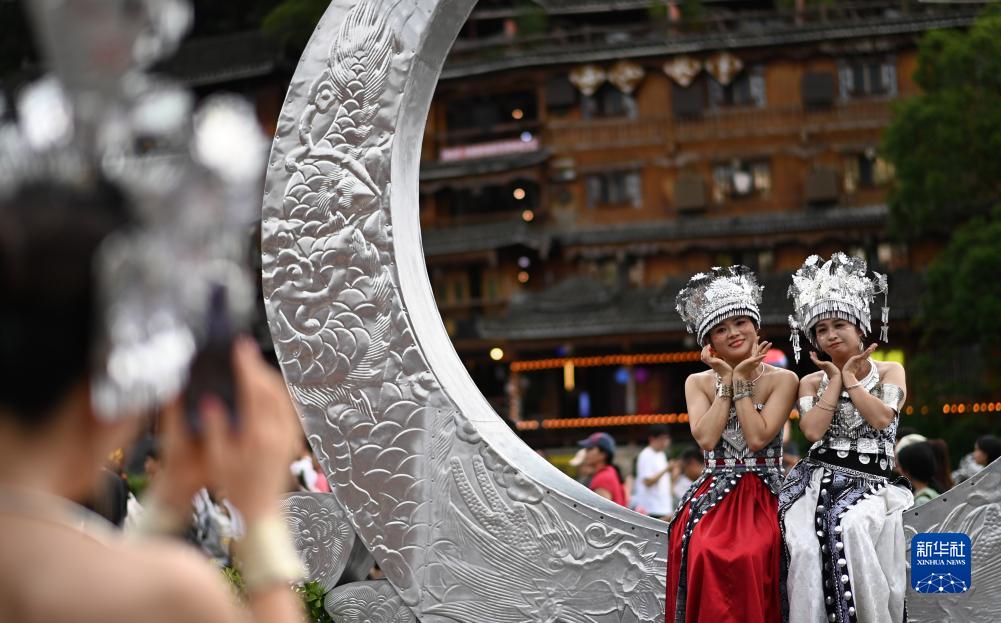 8月1日,游客在貴州省黔東南苗族侗族自治州雷山縣西江千戶(hù)苗寨景區游覽拍照。