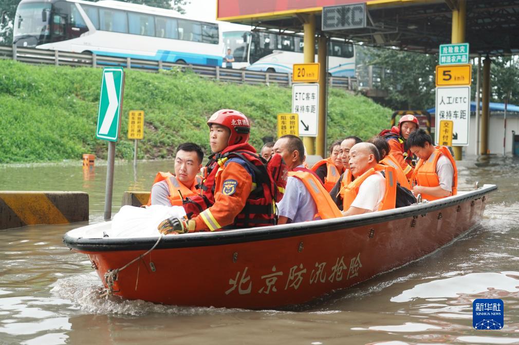 8月2日,在北京市房山區的京港澳高速琉璃河出口,受災群眾乘坐沖鋒舟前往轉運車(chē)輛乘車(chē)點(diǎn)。