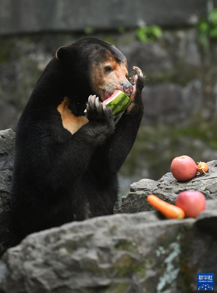 8月2日,馬來(lái)熊在杭州動(dòng)物園享用水果。