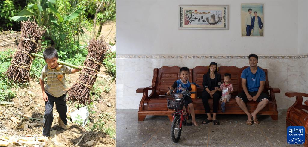 這是一張拼版照片:左圖為2009年7月14日,吳星??钢?zhù)藥藤下山(新華社記者張愛(ài)林攝);右圖為2023年7月31日,吳星海與妻子和兩個(gè)兒子在新居中合影(新華社記者費茂華攝)。新華社發(fā)